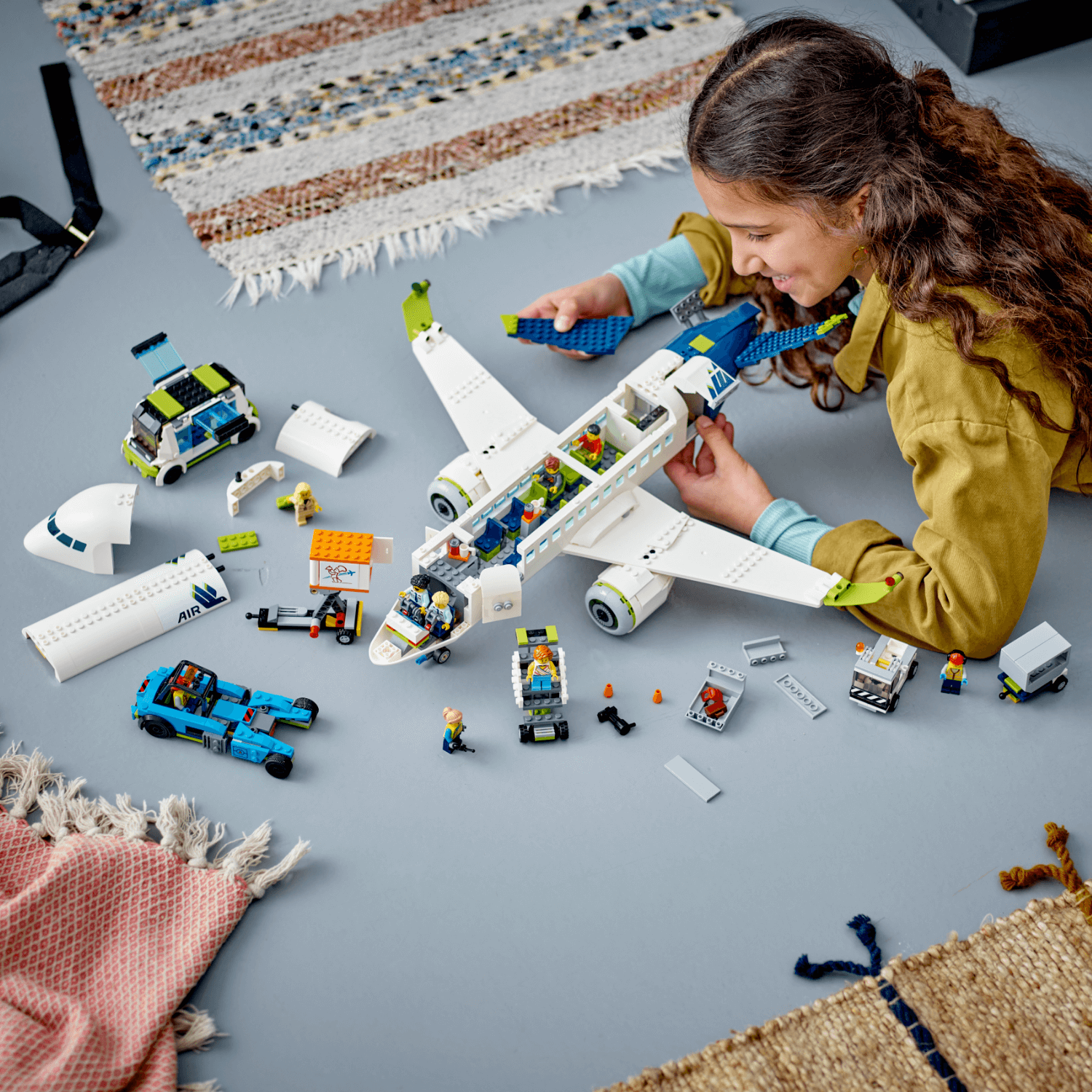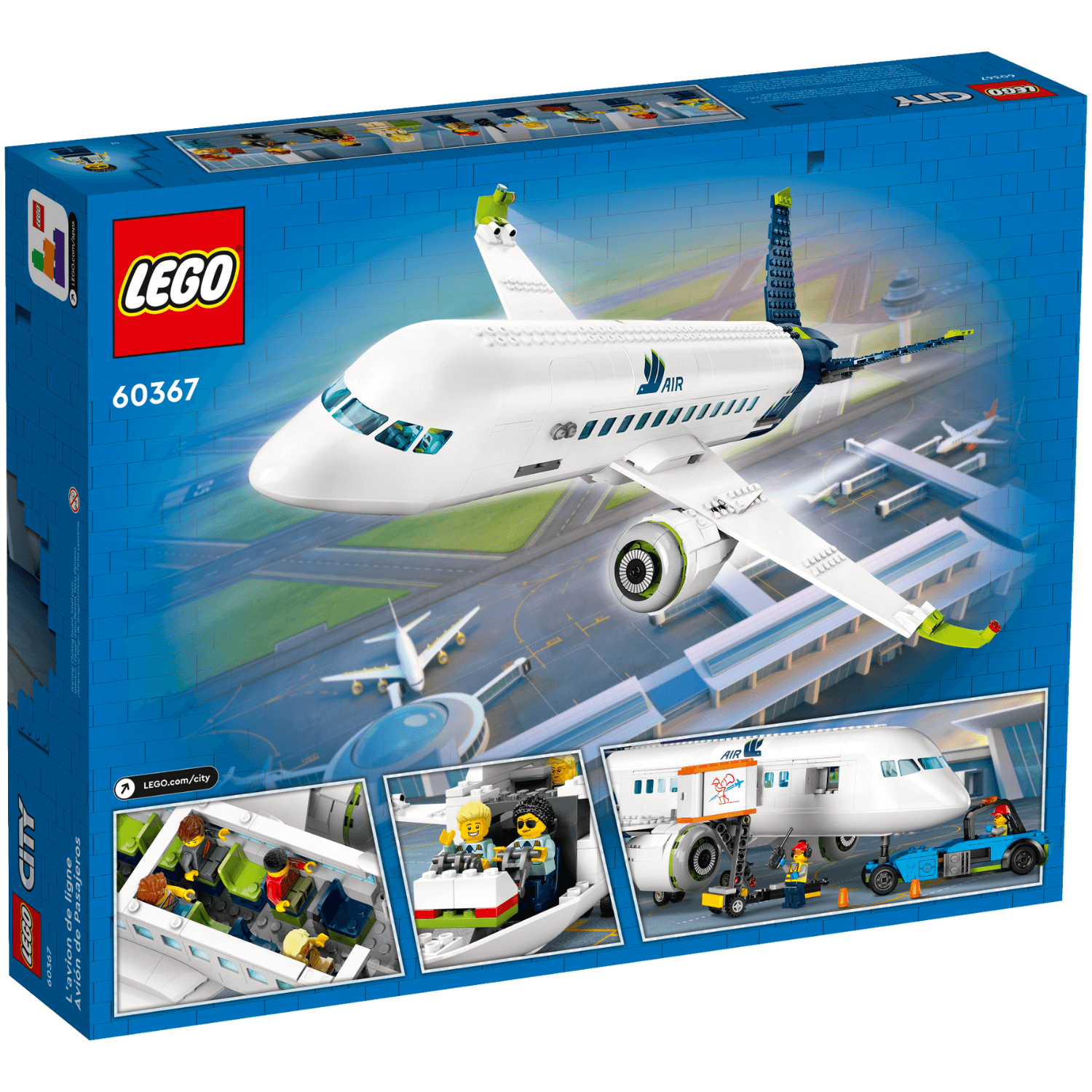 LEGO® City Putnički avion spreman je za polijetanje. Stiže autobus s putnicima, vrijeme je za postavljanje stepenica da se mogu ukrcati. Kamion za catering utovara hranu i pića, stigli su nosači prtljage, a tegljač je spreman za pripremu aviona. Unutra je sve spremno i čisto – prolazi, sjedišta i toaleti. Pripremi se za polijetanje!