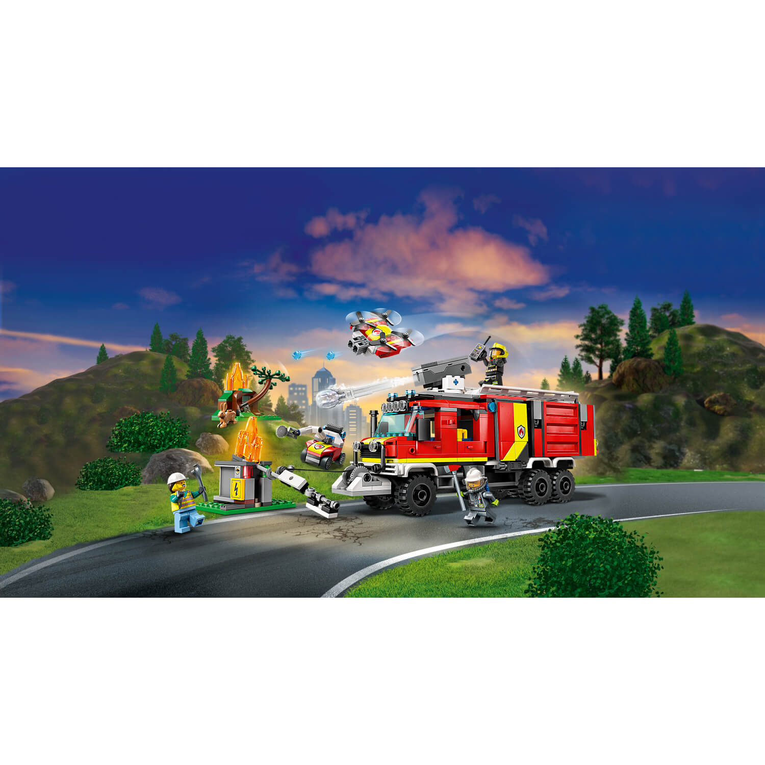 Pridruži se vatrogascima iz LEGO® Cityja u ultramodernom vatrogasnom kamionu. Ovo vozilo ima sve što trebaš da spasiš situaciju! Protupožarnim aparatom i vatrogasnim dronom iz kamiona izbaci posebne vatrogasne elemente. Kranom kamiona pomakni teške predmete. Ako postane prevruće, pokreni kopneni dron sa robotskom rukom. Pripremi se za akciju!